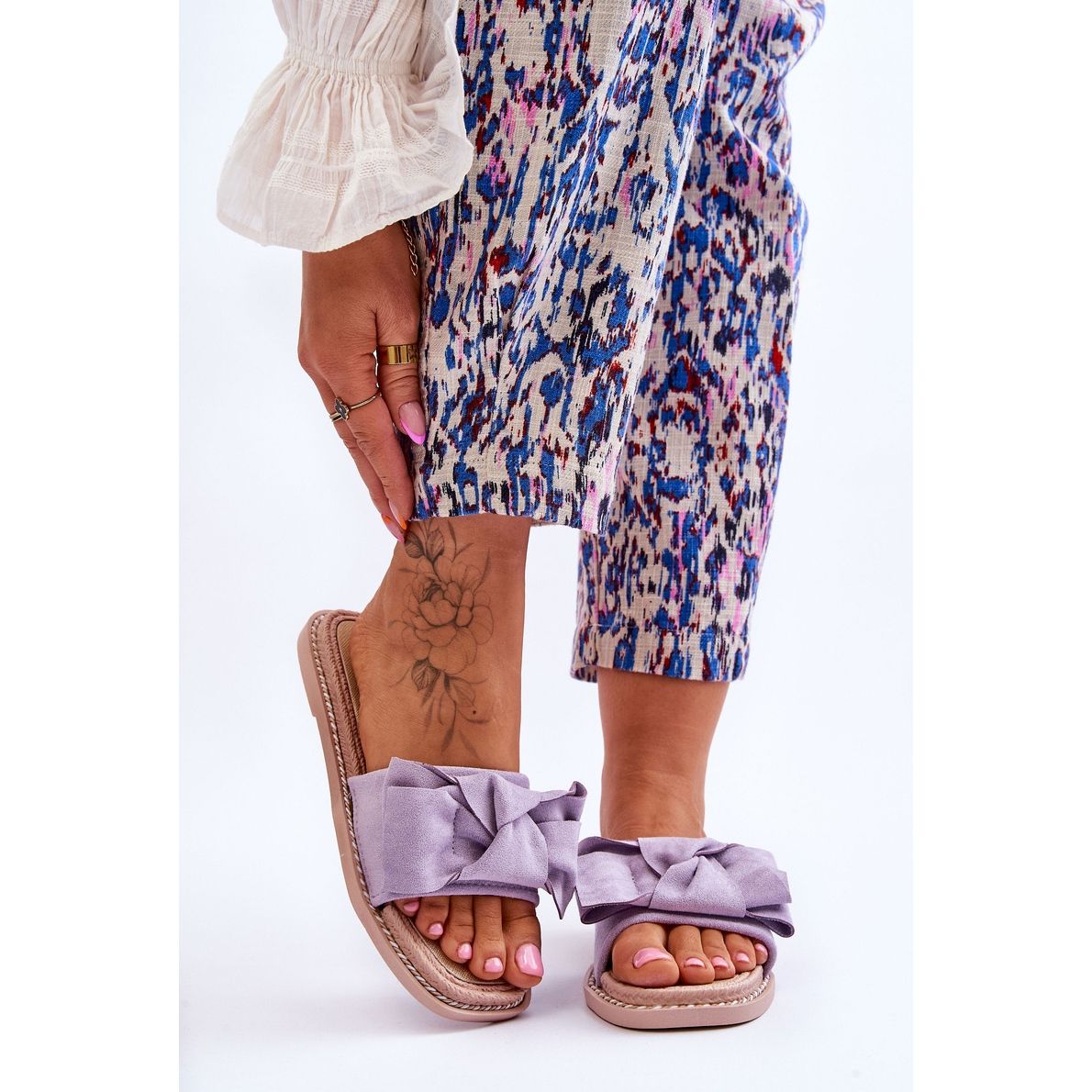 Elegantes, y al mismo tiempo, cómodas zapatillas, ideales para estilizaciones diarias en primavera y verano. La parte superior hecha de gamuza ecológica en un delicado tono morado (lila) decorado con un arco sutil. El inserto y la suela de plástico de caucho aseguran la comodidad, la flexibilidad y la durabilidad del uso. La suela no es Slip, y alrededor de su borde hay una cuerda decorativa que agrega carácter. El modelo se coloca en un talón plano bajo (plataforma/suela de aproximadamente 1,5 cm), lo que garantiza la estabilidad y la comodidad durante todo el día.