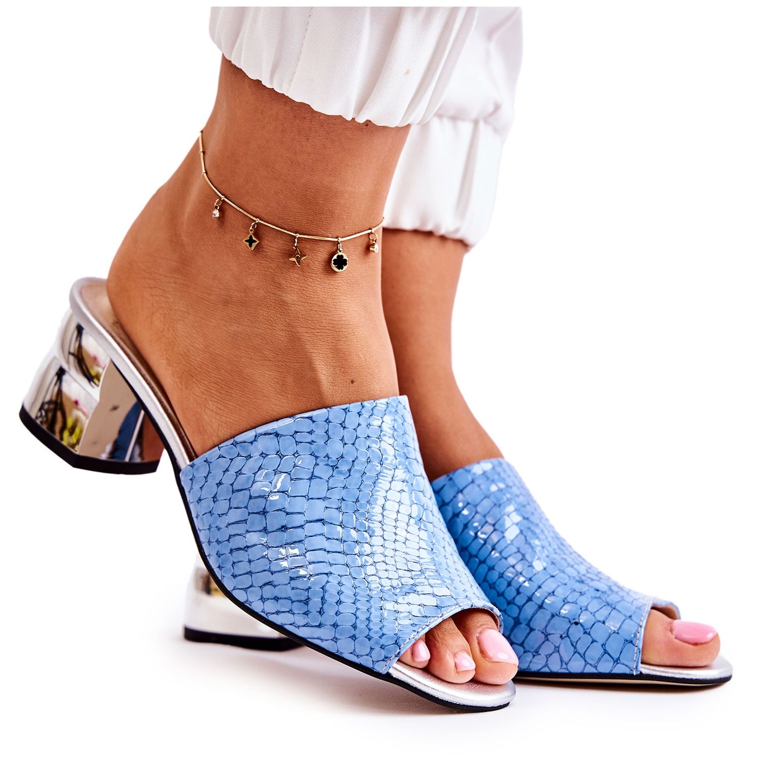 Las zapatillas de cuero para mujer Perry: azules, con un patrón de cocodrilo, son una combinación de clásicos y un acento de moda. Ubicado en un talón de punto estable (altura de 5,5 cm), asegure un aspecto elegante mientras mantiene la comodidad. La plantilla superior y suave está hecha de cuero natural, lo que garantiza una buena transpirabilidad y un ajuste perfecto al pie del pie. Modelo resbalado, con una nariz abierta y redondeada, una excelente opción para días cálidos.