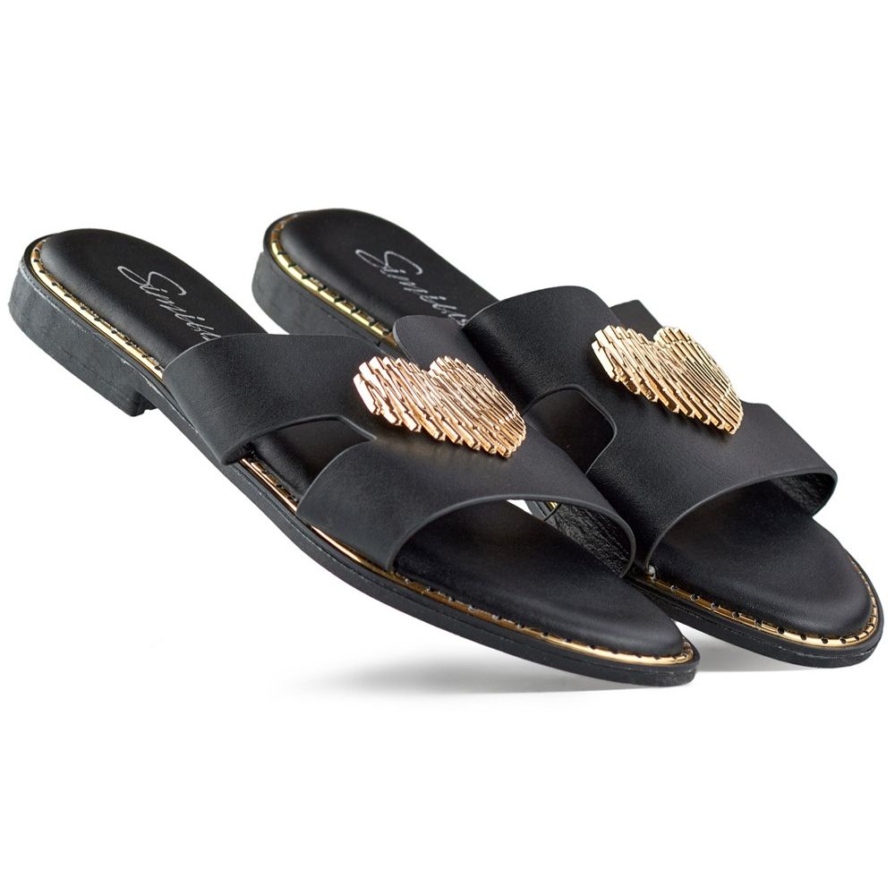 Negro con color dorado acentuando el corazón, estas chanclas se mezclarán bien con varios atuendos. La altura de la plataforma de 1 cm asegura una discreta comodidad, y el inserto ecológico se preocupa por la comodidad de los pies durante todo el día.