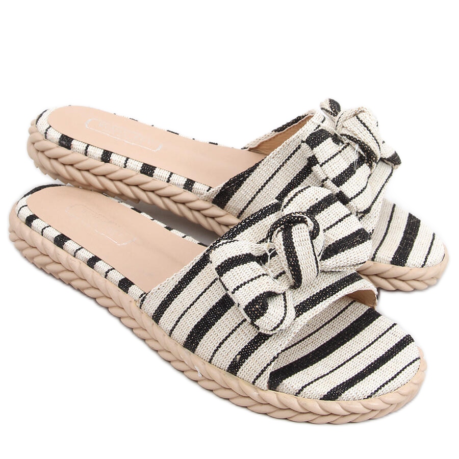 Las chanclas están disponibles en negro y beige, lo que permite combinarlas fácilmente con varios estilos. El material del inserto es cuero ecológico, lo que demuestra la preocupación del fabricante por el medio ambiente. La altura del tacón de sólo 3 cm hace que las chanclas sean prácticas y cómodas, y el estampado de rayas adicional les da un carácter fresco y veraniego.