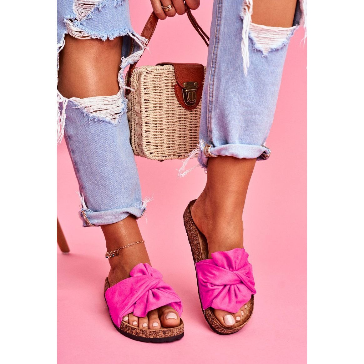 ¡Descubre el encanto del verano con las chanclas de mujer con suela de corcho de la marca PS1! Estas singulares chanclas en un hermoso tono fucsia, decoradas con un encantador lazo, son un elemento inseparable del estilismo veraniego. Su diseño no solo es estético, sino también funcional: el diseño sin cordones permite calzarlos rápidamente y la plantilla suave y perfilada garantiza comodidad incluso con un uso prolongado.