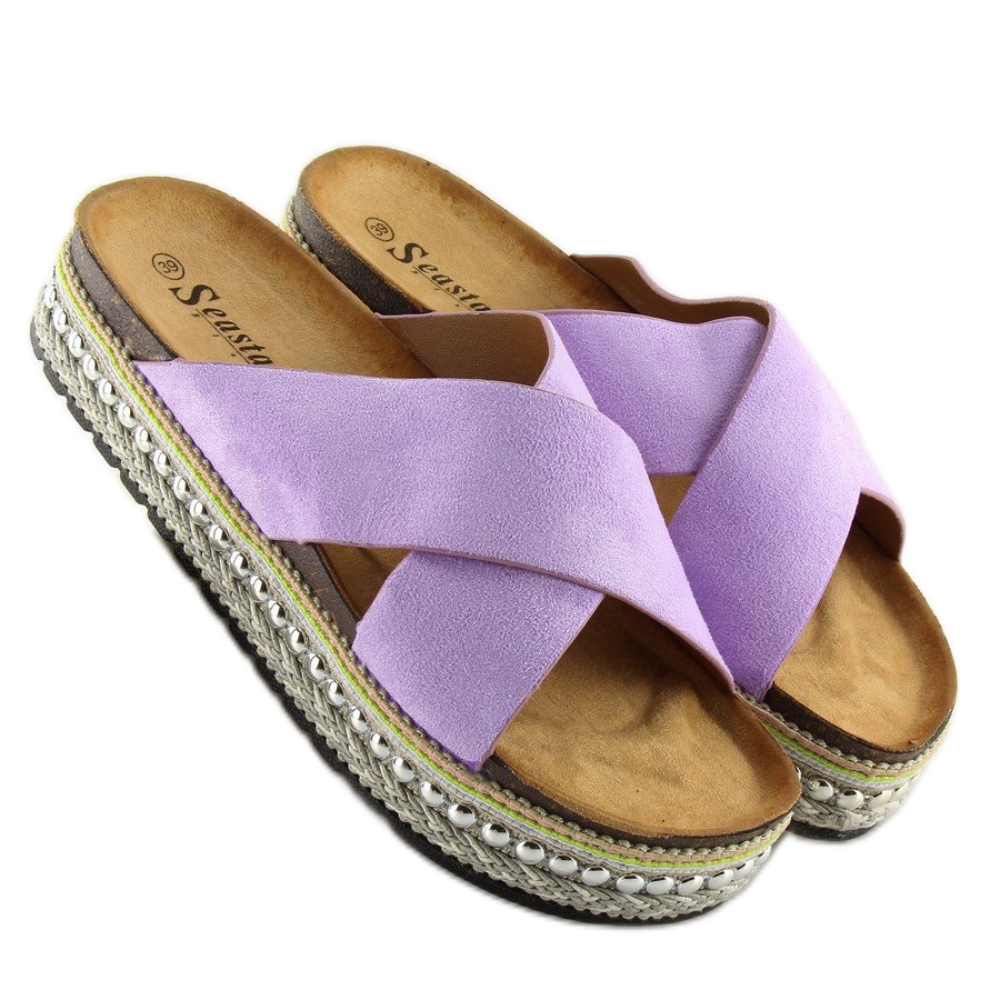 Fabricadas en ante ecológico de alta calidad, estas chanclas lucen extremadamente elegantes. El color violeta combinado con pedrería aporta encanto y originalidad. El interior de las chanclas está acabado con un tejido suave, lo que garantiza comodidad y confort al usarlas.