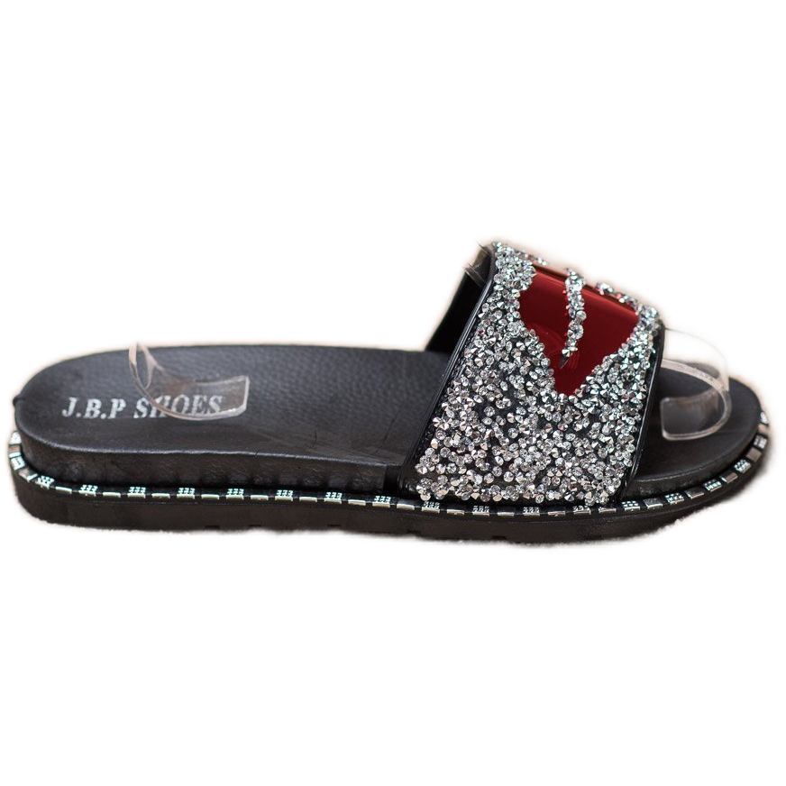 La parte superior de cuero ecológico no sólo es respetuosa con el medio ambiente, sino también fácil de cuidar. Los diamantes de imitación decorativos y una aplicación única en forma de labio les dan un carácter único, convirtiéndolos en un complemento perfecto para muchos estilos de verano.