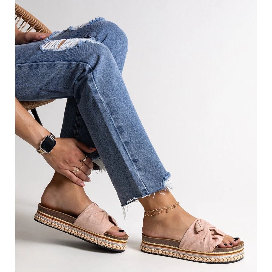 Hecho de cuero de gamuza ecológico, los flip -flops garantizan no solo usar comodidad, sino también apariencia estética. El delicado rosa pálido combinado con una suela negra les da un personaje único, y el arco decorativo introduce una nota de elegancia para las estilizaciones cotidianas.