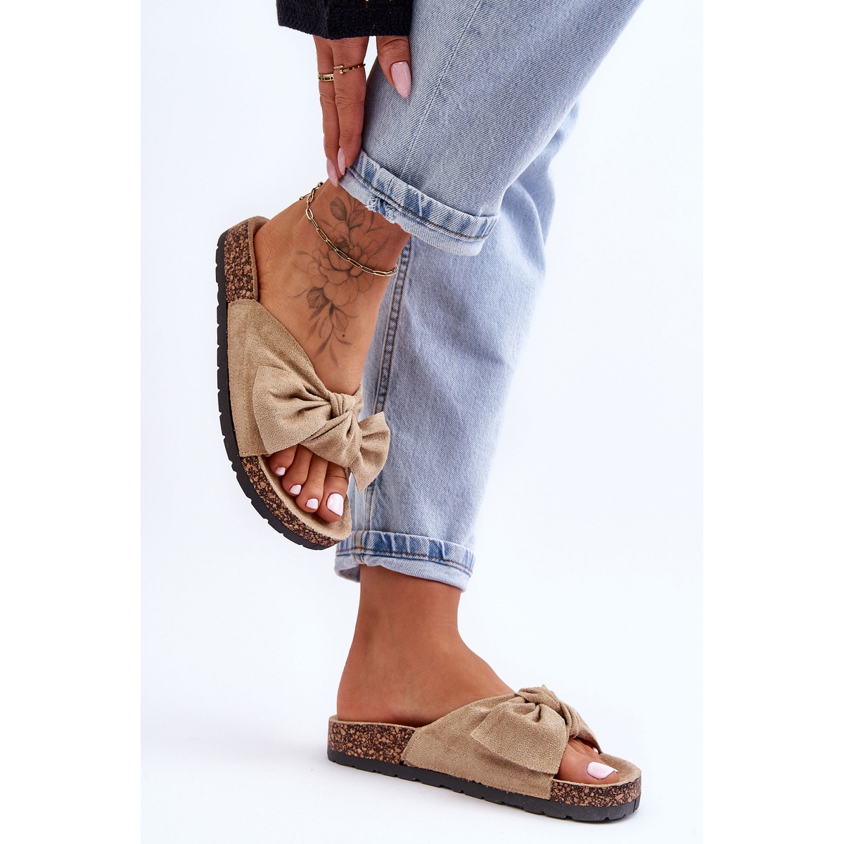 Hechas de ante ecológico suave de alta calidad en un tono beige marrón claro, estas chanclas no solo son elegantes, sino también agradables para la piel y cómodas de usar. El material suave y flexible se adapta agradablemente al pie y el encantador lazo en la parte delantera aporta un encanto femenino.
