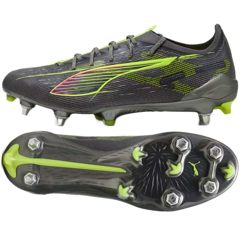 Los zapatos de fútbol Puma Ultra 5 Ultimate MXSG 108343-03 son una gran opción para cada hombre que quiere aumentar su velocidad en el campo, especialmente cuando juega en una superficie suave y fangosa. Estos atascos de tráfico profesionales de la línea de paquete más rápida se distinguen por un diseño moderno en colores grises con acento verde, lo que los hace funcionales y elegantes.