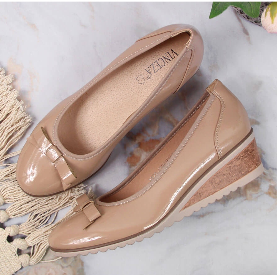 Los zapatos de tacón con cuña de charol beige de Vinceza son una opción perfecta para las mujeres que desean combinar comodidad con elegancia. Estos elegantes zapatos cuentan con una parte superior bellamente brillante que agregará brillo a cualquier atuendo, tanto informal como más formal.