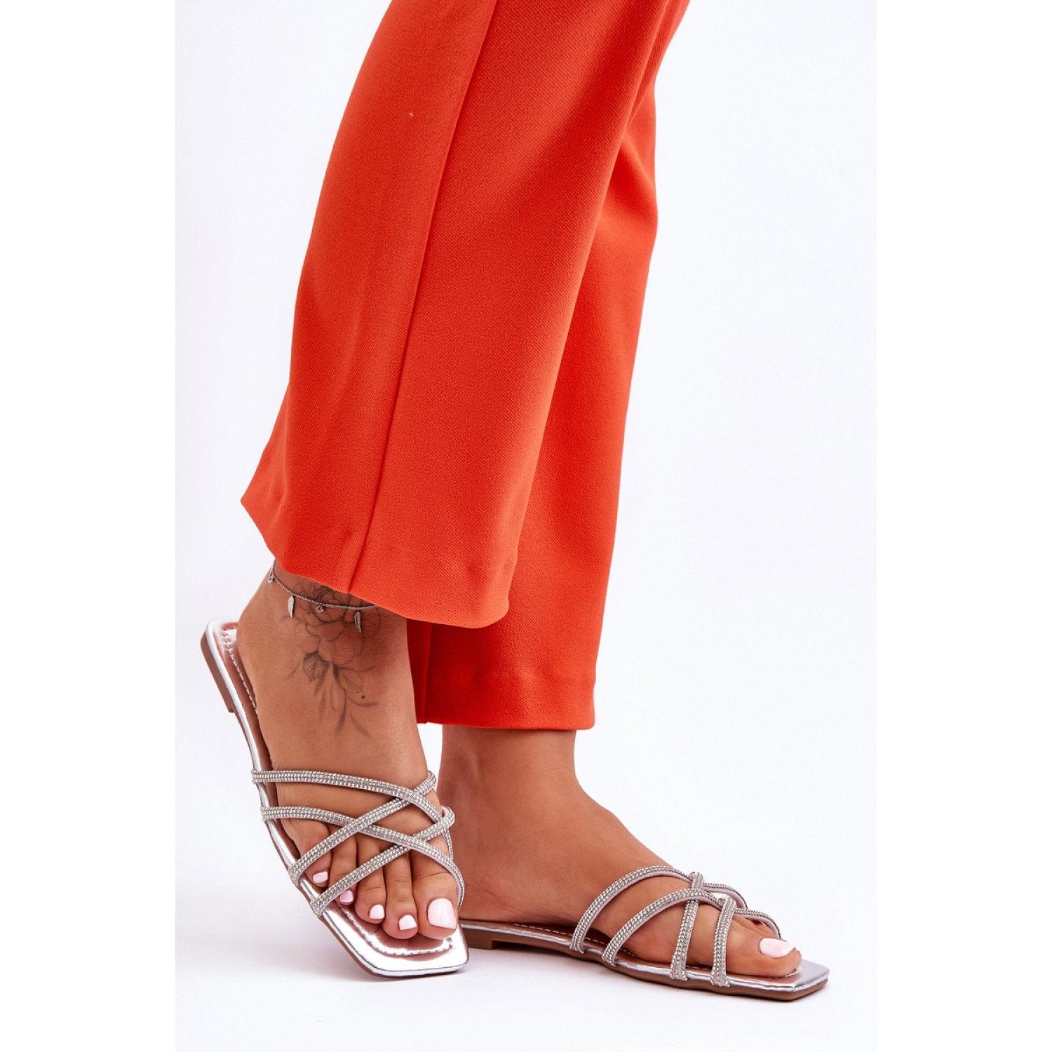 Las zapatillas de mujer elegantes están hechas de tela en la parte superior. Las rayas en el frente están entrelazadas entre sí y están decoradas con pedrería que imita a la pedrería. Las pantuflas tienen un inserto suave y cómodo hecho de cuero ecológico. ¡Este calzado es el calzado perfecto para muchas estilizaciones en los días calurosos! ¡Absolutamente deberías tenerlos!