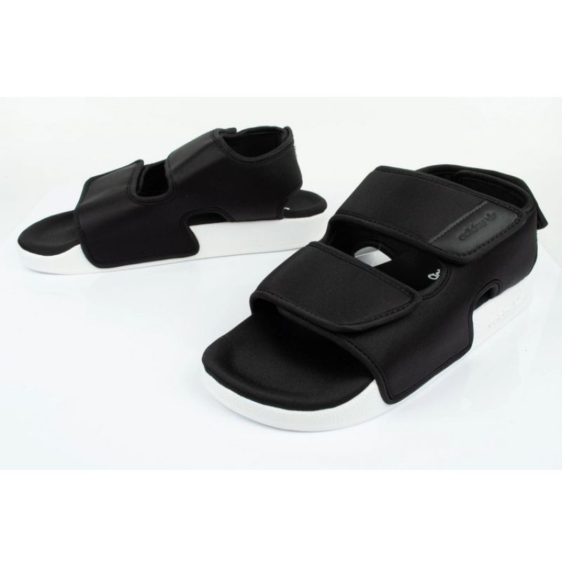 La descripción del producto presenta sandalias deportivas para hombre de Adidas de la línea Adilette, modelo código EG5025. Son de color negro con suela blanca. Fabricado en material textil que asegura una alta calidad y comodidad de uso. Una solución particularmente conveniente es el cierre de velcro ajustable, que le permite ajustar las sandalias al ancho individual del pie. Este calzado es perfecto para actividades al aire libre y viajes.