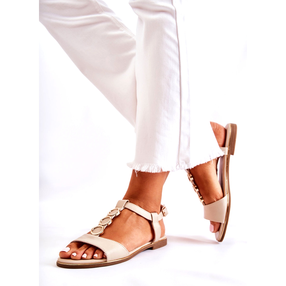 Un tacón plano con una altura de 1 cm y una suela sinlips hecha de plástico de caucho hacen que las sandalias sean perfectas tanto para caminar por los callejones del parque como las salidas de verano con amigos. Disponible en un elegante color beige con la adición de acentos dorados, serán un complemento perfecto para cada guardarropa de verano.