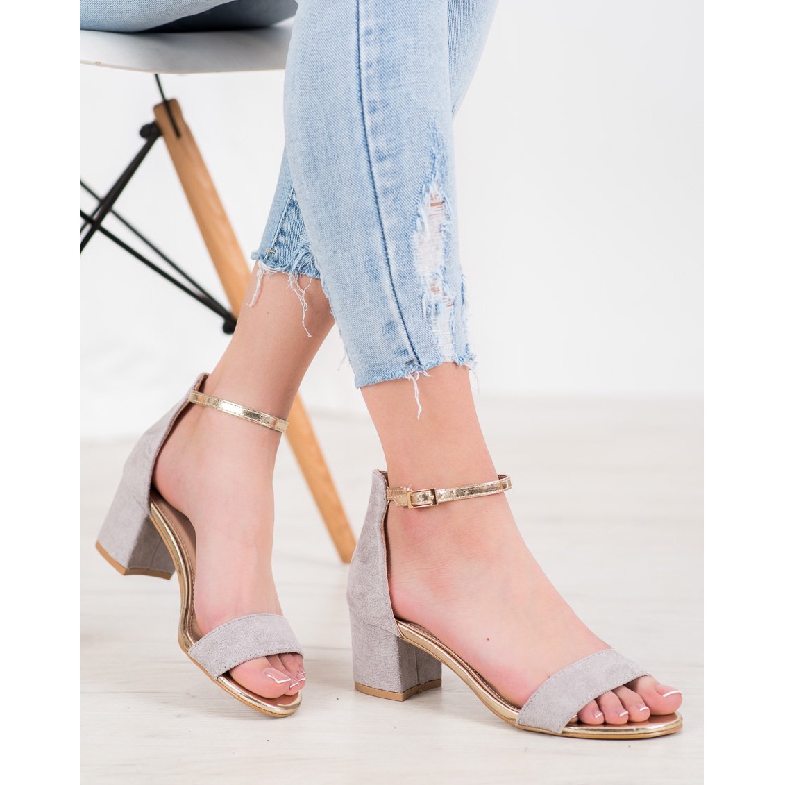 Los zapatos tienen un tacón de bloque estable de 6 centímetros, que garantiza comodidad al usarlos, perfectos para largas veladas o celebraciones. La parte superior con tacón incorporado y una correa de ante encima de los dedos realza el estilo elegante de las sandalias. Además, el talón está decorado con una correa dorada con una elegante hebilla, lo que les da un carácter único.
