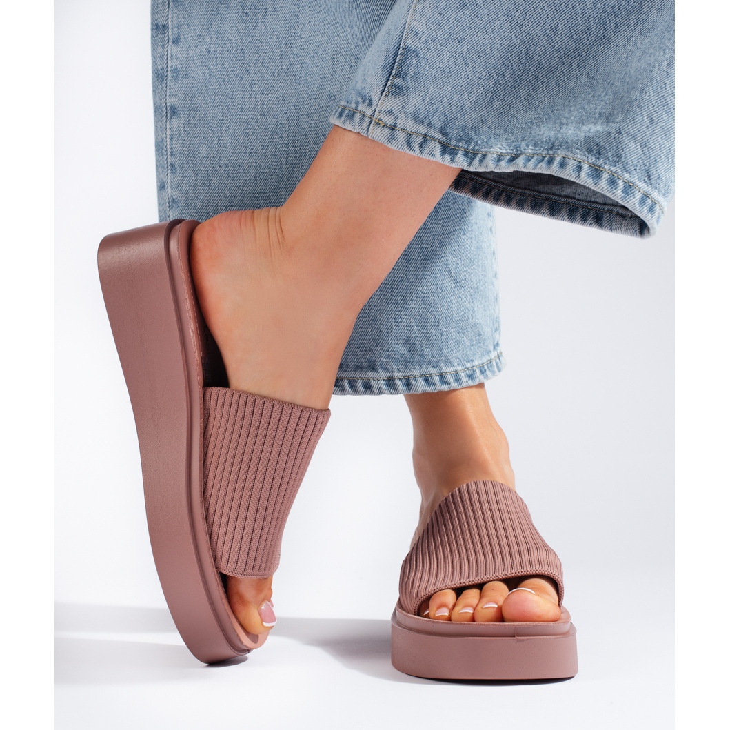 Hecho de material textil de alta calidad, los flips, los flips aseguran la durabilidad y la comodidad del uso. La imitación de la piel dentro del zapato asegura la suavidad del pie, y el talón abierto y el corte insertado hacen que ponerlos en un verdadero placer. La cuña de 5 cm de altura agrega no solo una altura delicada, sino también estabilidad, lo que hace que estas chanclas sean una opción ideal para caminatas largas o reuniones informales con amigos.