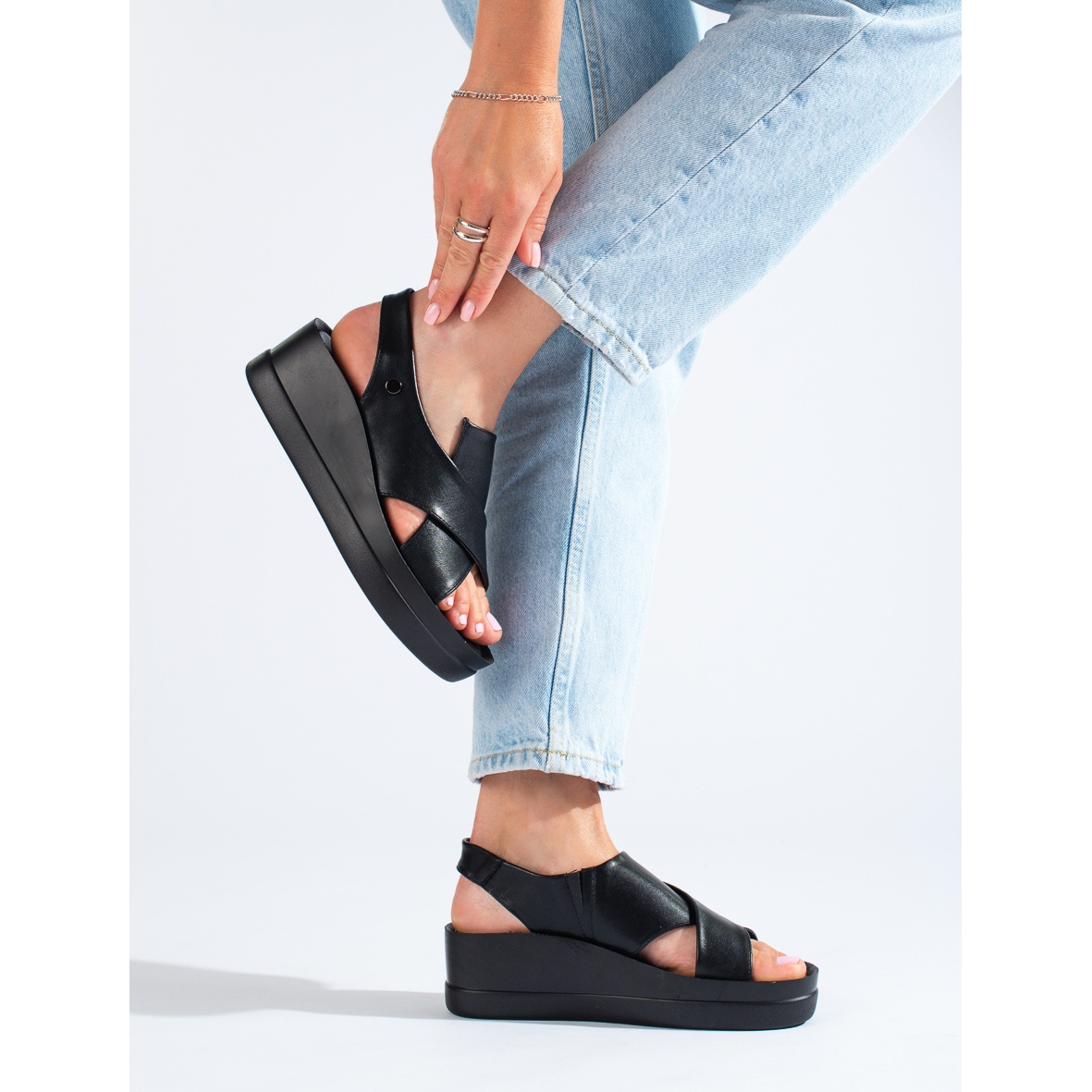 Ofrecemos elegantes sandalias de cuña Shelovet para mujer en un clásico color negro: el accesorio perfecto para cualquier ocasión. Con el talón abierto y sin puntera, estas sandalias son perfectas para los días cálidos, aportando comodidad y estilo.