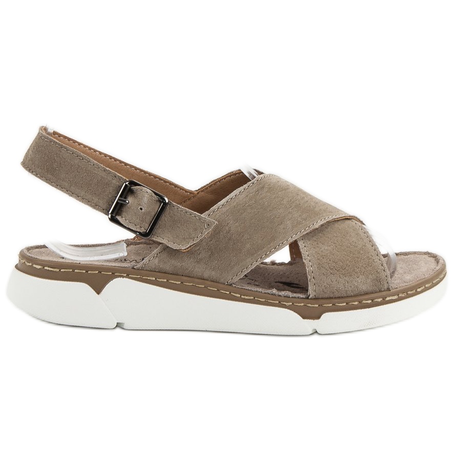Las sandalias se caracterizan por un tacón plano y una plataforma de 3,5 cm de altura, lo que las hace cómodas incluso al caminar durante mucho tiempo. Además, el uso de piel natural en la plantilla permite sentirte cómoda, incluso en los días más cálidos. El cierre de hebilla garantiza la estabilidad del pie y el talón abierto aporta ligereza a cualquier estilo.