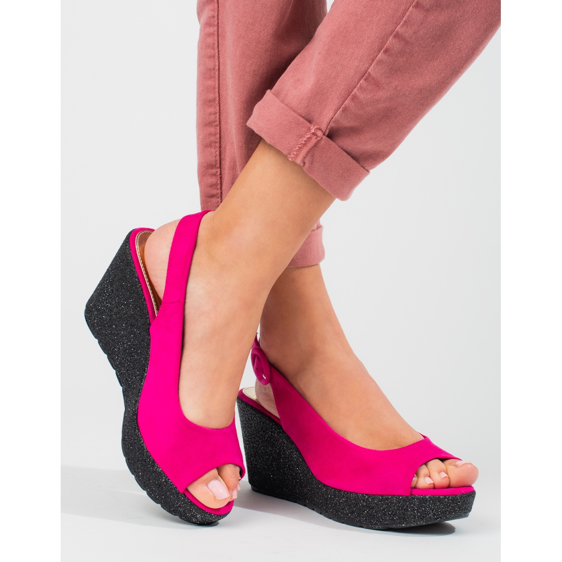 Las sandalias se distinguen por un corte clásico, talón abierto y puntera abierta, lo que garantiza comodidad y transpirabilidad. El tacón de 8 cm de altura aporta elegancia, y la plataforma de 2,5 cm de altura hace que caminar con ellos sea un placer. Fabricadas en ante sintético, estas sandalias convencen no sólo por su estética, sino también por la calidad de los materiales utilizados. El interior del zapato está cuidadosamente acabado con piel natural y ecológica, lo que garantiza la comodidad de uso.