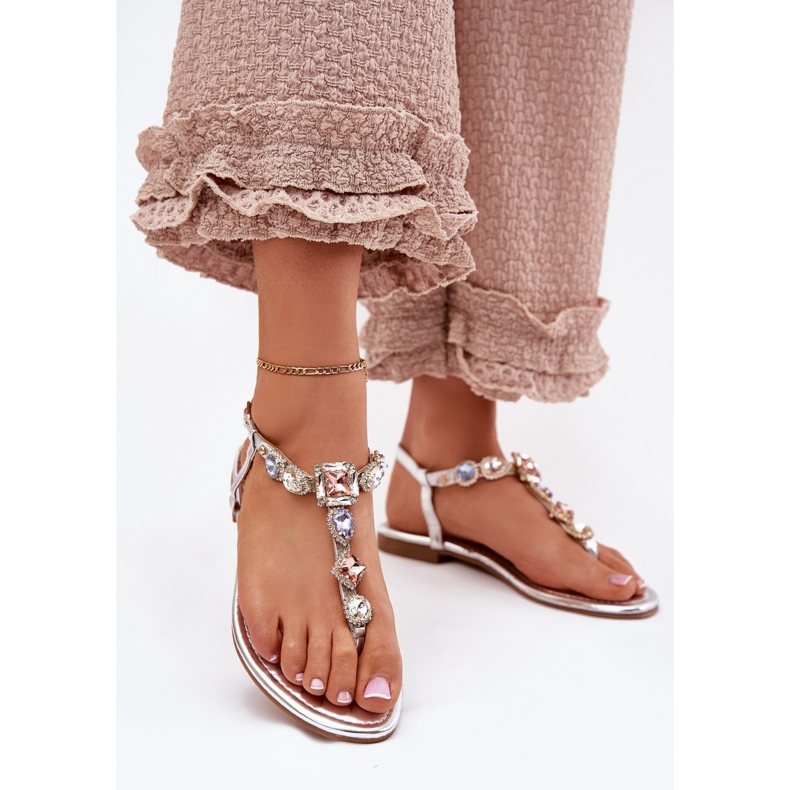 Descubra sandalias de mujer de ceñadas planas únicas con cristales en un elegante color plateado. Estas elegantes sandalias hechas de cuero ecológico de alta calidad combinan comodidad con un diseño de moda, lo que las convierte en la elección perfecta para los días de verano.