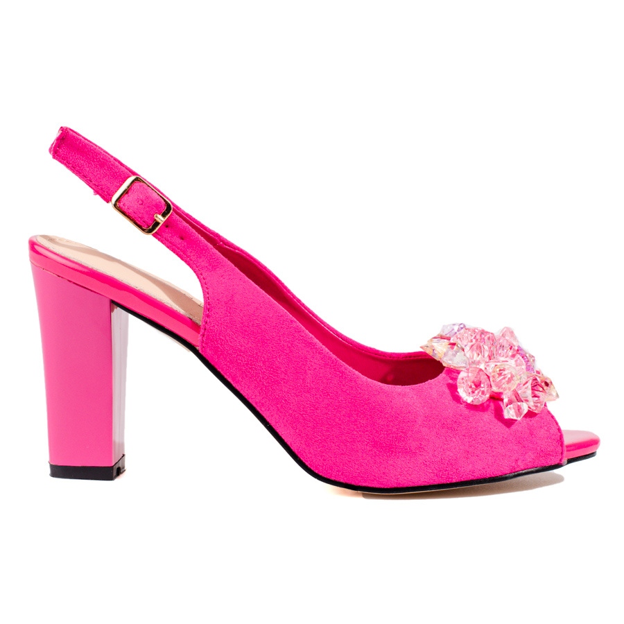 Con un tacón abierto y un elegante tacón en bloque de 9 cm, estas sandalias realzan perfectamente la figura, haciéndola estilizada. Los cristales que decoran los zapatos añaden elegancia y hacen que cada estilismo sea único.