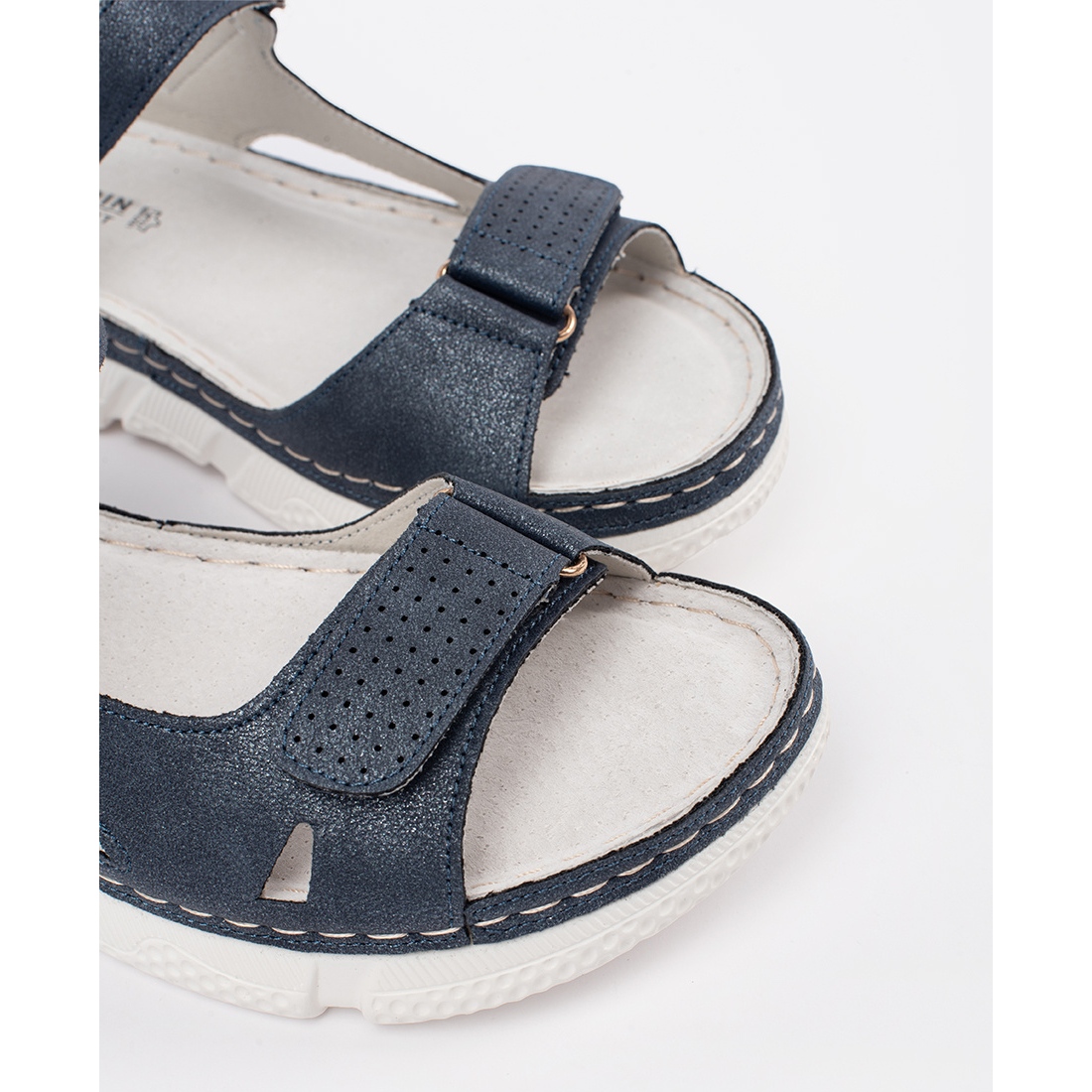 Corte clásico y elegante en un tono azul marino se mezcla perfectamente con varios atuendos, desde faldas casuales, cortos, hasta vestidos endeble. Un talón plano con una altura de 4 cm garantiza la estabilidad, lo que hace que estas sandalias sean una opción ideal para caminatas largas o deambulaciones de la ciudad.