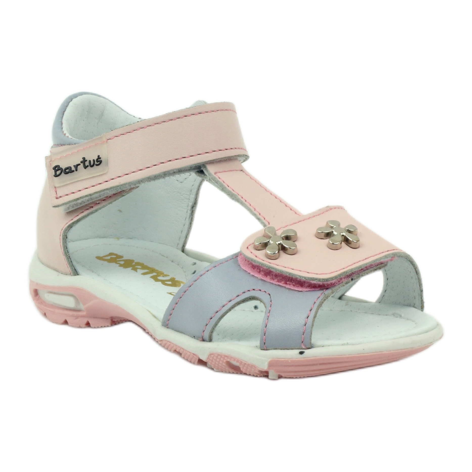 Delicadas y funcionales sandalias para niña fabricadas íntegramente en piel natural. El modelo Bartuś 138 combina un toque rosa juvenil con un gris tenue, y las sutiles flores metálicas añaden encanto a los zapatos.