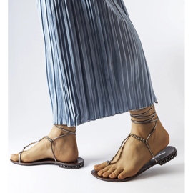 Sandalias grises oscuras Troghi es una proposición ligera y universal para los días cálidos. La parte superior hecha de cuero ecológico con acentos metálicos sutiles y circones y diamantes de imitación brillantes agrega elegancia a ellos, y el cierre de encaje le permite combinar perfectamente la sandalia con el pie. Un talón plano y bajo (aproximadamente 1,5 cm) y una plantilla de cuero ecológica suave aseguran la comodidad todo el día.