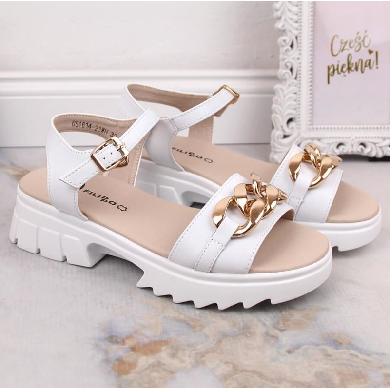 El color blanco universal de las sandalias Filippo llama la atención y las convierte en un complemento perfecto para los conjuntos de verano. Este color clásico combina fácilmente con una variedad de prendas, desde vestidos fluidos hasta pantalones cortos informales. Un toque dorado adicional en forma de cadena resaltará sutilmente tu estilo y añadirá brillo a tus conjuntos.