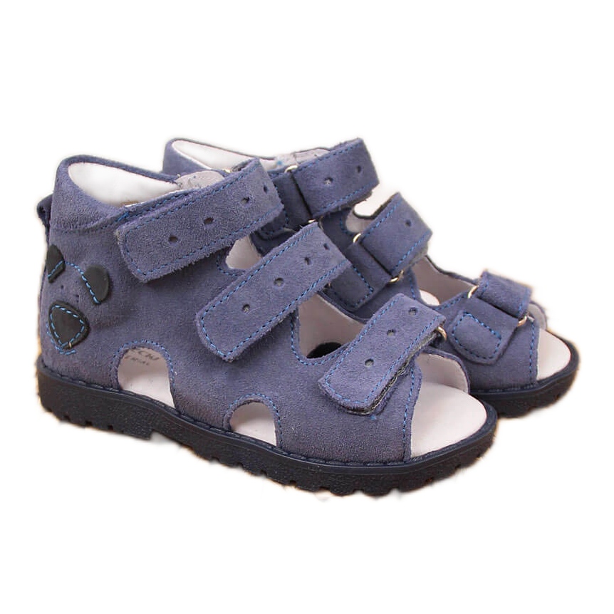 Las sandalias de cuero para niño Kornecki con un osito de peluche en azul son una opción perfecta para todo pequeño explorador. Este calzado único, registrado como dispositivo médico, fue diseñado para el desarrollo adecuado de los delicados pies de los niños, lo que los convierte en una solución ideal para los niños activos.