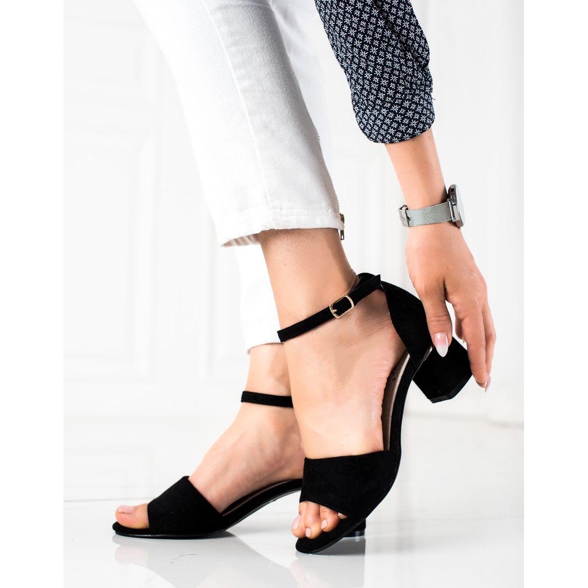 Estas sandalias de tacón han sido diseñadas prestando atención al detalle. El tacón cónico de 5 cm garantiza una silueta elegante y comodidad en cualquier situación. Fabricadas en ante ecológico, las sandalias se ajustan perfectamente al pie, y su construcción suave con talón incorporado las hace extremadamente cómodas, incluso cuando se usan durante largos períodos de tiempo.