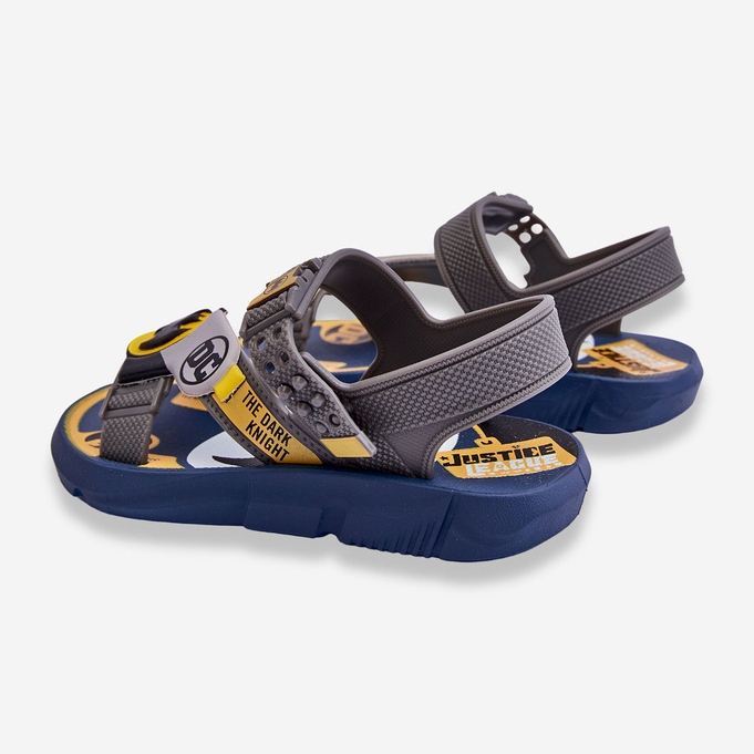 El producto son unas sandalias infantiles de la colección Grendene Kids, modelo JJ385049. El color del calzado es un tono gris con amarillo. Las sandalias fueron diseñadas pensando en los fanáticos del popular personaje de Batman: motivos relacionados con este superhéroe y la Liga de la Justicia decoran toda la sandalia.