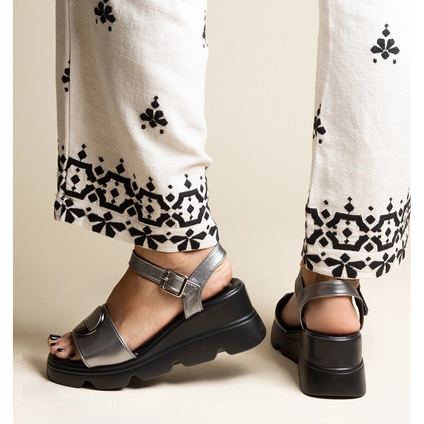Una cuña alta con una altura de 7 cm no solo le agrega unos centímetros de altura, sino que también te hace ver elegante. La "pistola" de color plateado en combinación con una suela de plástico negro hace que estas sandalias sean extremadamente versátiles, ideales para muchas estilizaciones de verano, tanto a diario como para ocasiones especiales.