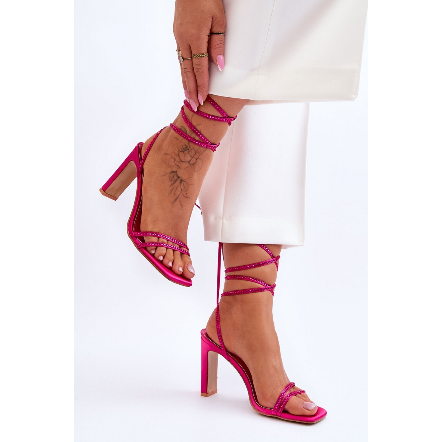 La sorprendente forma irregular del talón, de 9,5 cm de altura, agrega originalidad a los zapatos y los convierte en un gran complemento para cualquier estilización. Gracias a las rayas delgadas, este modelo es extremadamente aireado y perfecto incluso en los días más cálidos.