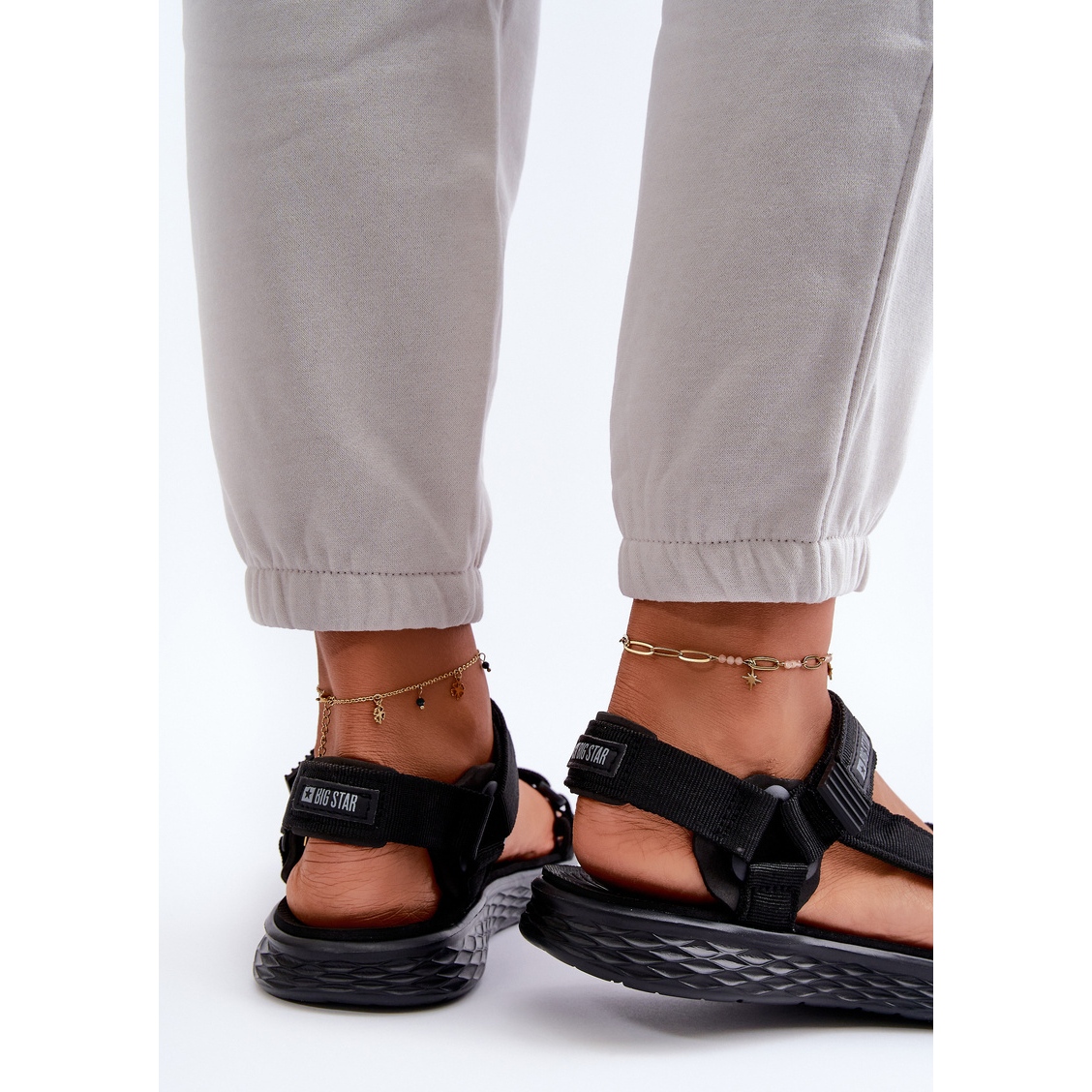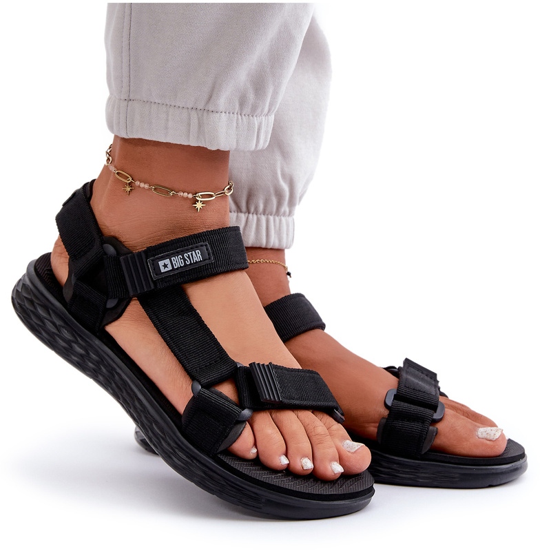 Las sandalias de mujer son zapatos cómodos que fueron producidos por la marca conocida y de renombre, que es Big Star. El calzado fue confeccionado en un color negro universal, gracias al cual quedará muy bien con muchas prendas que uses. Tiene una suela plana y cómoda. Gracias a esto, son extremadamente cómodos y agradables de llevar. Los zapatos están hechos de materiales de la mejor calidad, que incluyen goma duradera y telas transpirables. Son fáciles de poner y quitar gracias al cierre de velcro.