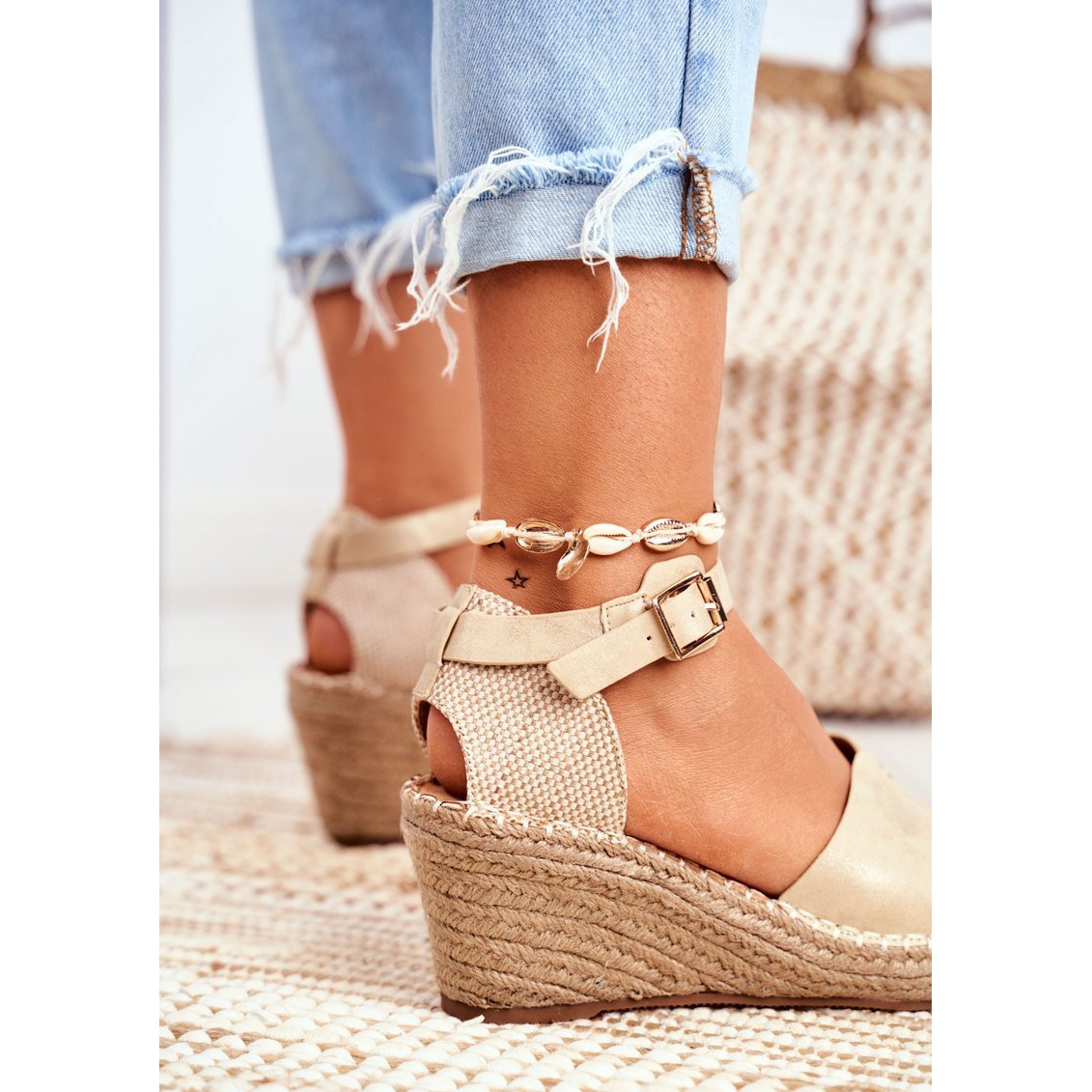 Las alpargatas de mujer son uno de los zapatos con más estilo para la primavera y el verano. Las alpargatas doradas con tacón de cuña más alto son una propuesta perfecta para las mujeres que buscan cada día un calzado cómodo, que se convertirá en un gran elemento complementario a la estilización. Estos zapatos están hechos de piel ecológica de alta calidad en un tono dorado cálido. Tienen una hebilla alrededor del tobillo. El color de los zapatos enfatiza perfectamente el bronceado en las piernas, tiene un tono ligeramente iridiscente que armoniza maravillosamente con los elementos básicos en el guardarropa de verano de una mujer.