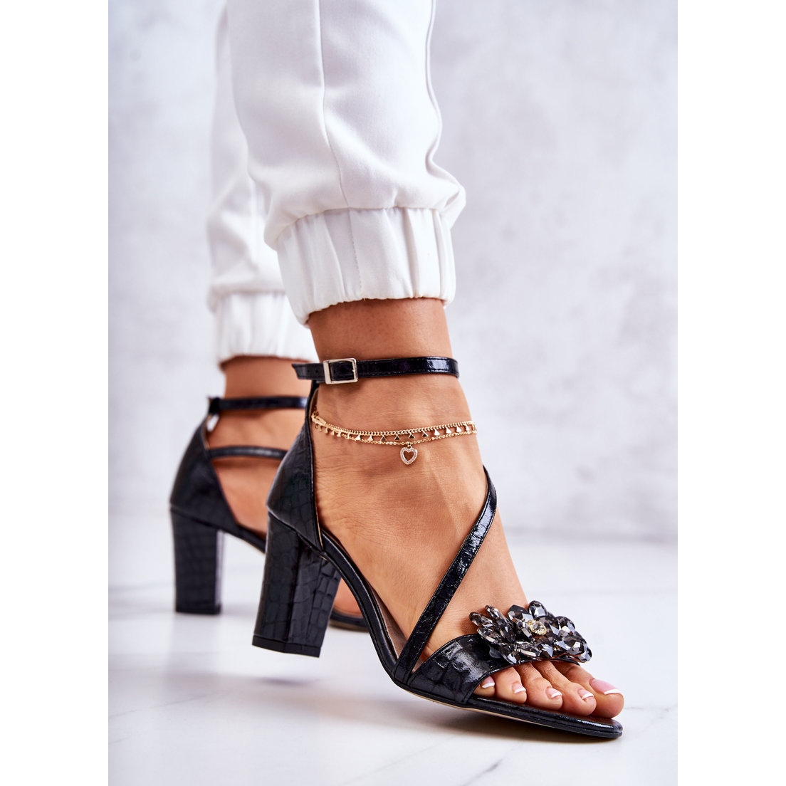 Hermosas sandalias de tacón alto hechas con atención al detalle de cuero natural de alta calidad. Llevan una raya en la parte delantera con un elegante adorno en forma de cristales de imitación y circonitas cúbicas. La correa sujeta en el medio está conectada con un talón rígido. Se abrocha al tobillo con una correa ajustable con hebilla. Una plantilla suave hecha de cuero natural le brindará comodidad y conveniencia. Tacón estable en forma de poste. Zapatos perfectos para todo tipo de celebraciones. Al elegir una talla, utilice la tabla de tallas.