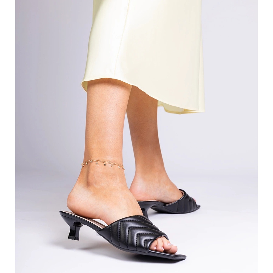 - Diseño: nariz cuadrada descubierta y talón descubierto; Franja ancha con acolchado