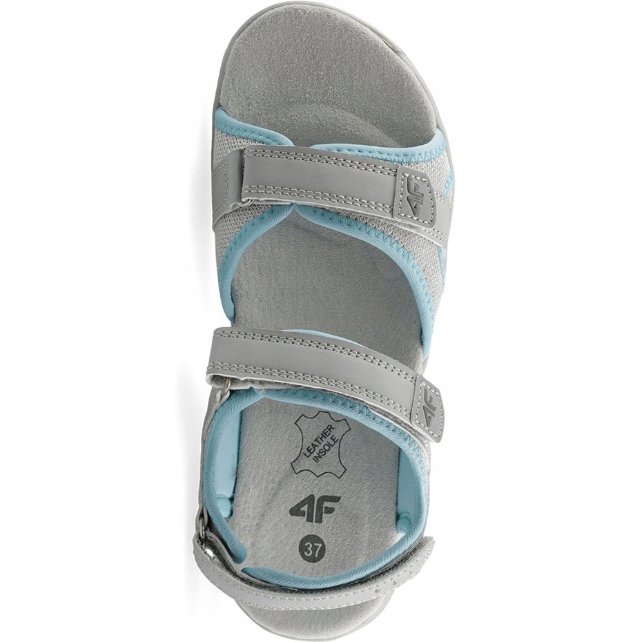 Sandalias para niña 4F, gris con elementos celestes. La suela de goma con banda de rodadura proporciona un buen agarre. La plantilla de cuero natural garantiza comodidad al caminar. Los elementos reflectantes aumentan la visibilidad y la seguridad después del anochecer. El cierre de velcro mejora el ajuste.