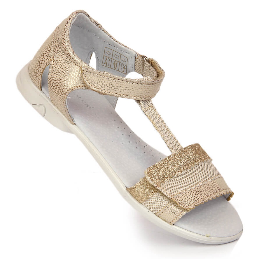 Ofrecemos sandalias de niña con cierre adhesivo en un hermoso color dorado de la reconocida marca Kornecki - modelo 6705. Estas sandalias de verano, perfectas para los días cálidos, serán un complemento perfecto para cualquier estilismo. Confeccionados con cuero exterior ecológico de alta calidad, garantizan comodidad y durabilidad, y el inserto y el forro de cuero natural garantizan la comodidad de uso.