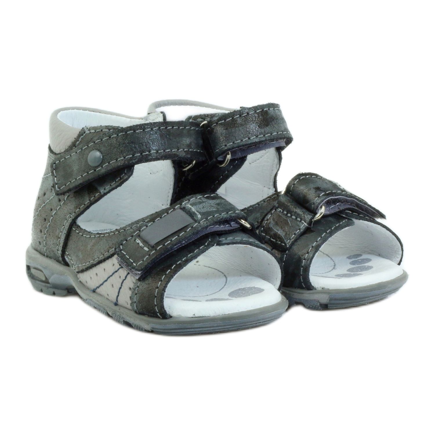 La tira delantera de las sandalias está decorada con un elemento reflectante que aumenta la visibilidad del niño incluso en días nublados. Gracias al talón rígido, el pie queda apoyado de forma estable, lo que minimiza el riesgo de lesiones durante el juego. La inserción de cuero, refinada con iones de plata, inhibe eficazmente el crecimiento de microorganismos, garantizando frescura y comodidad durante todo el día.