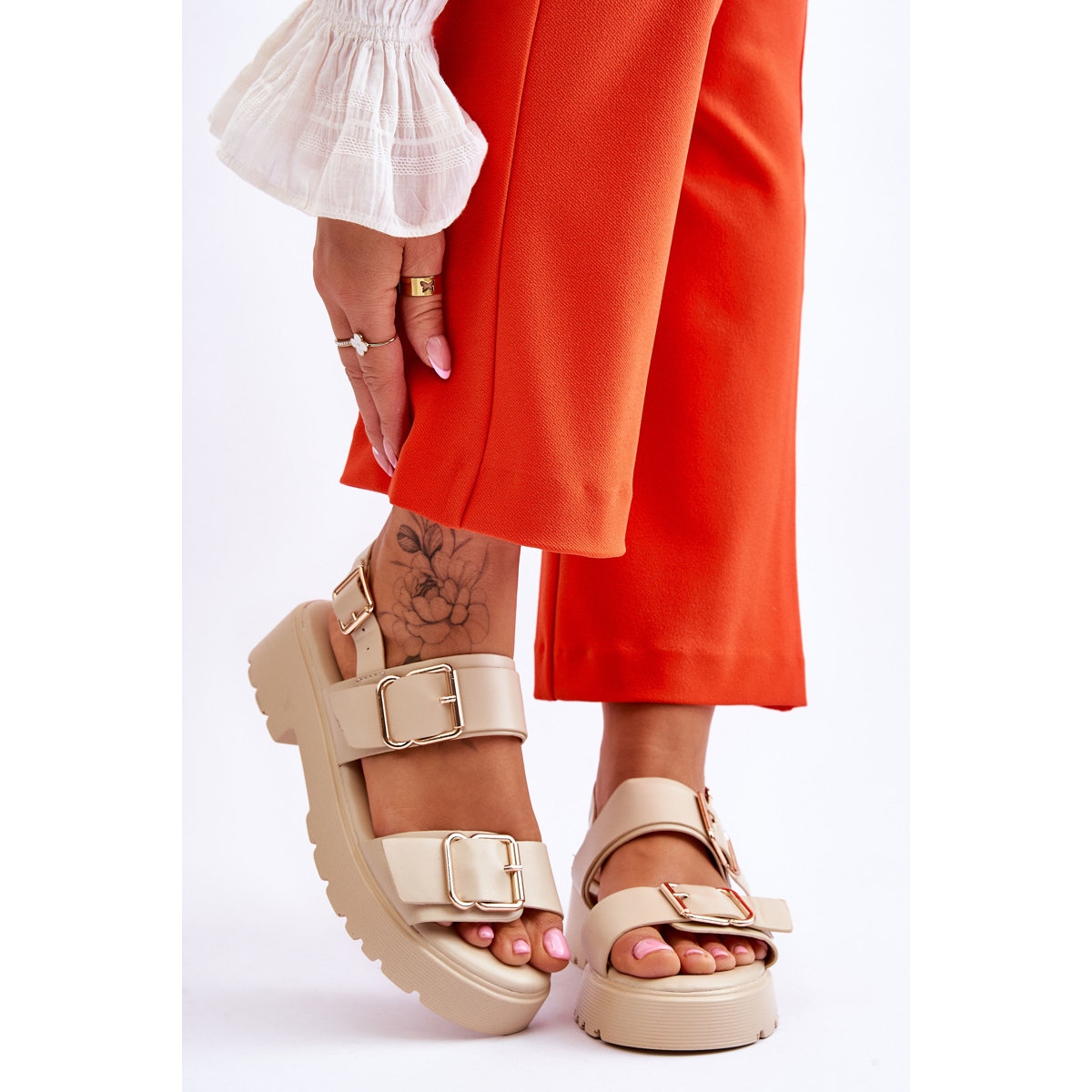 La comodidad de uso está garantizada por las suaves plantillas de piel ecológica y un tacón plano de 4,5 cm de altura combinado con una plataforma de 2,5 cm de altura, que garantiza estabilidad y alivia el pie. El delicado cierre alrededor del tobillo con una correa ajustable con hebilla cuadrada facilita el ajuste de la sandalia a la circunferencia individual del tobillo y les da un aspecto característico.