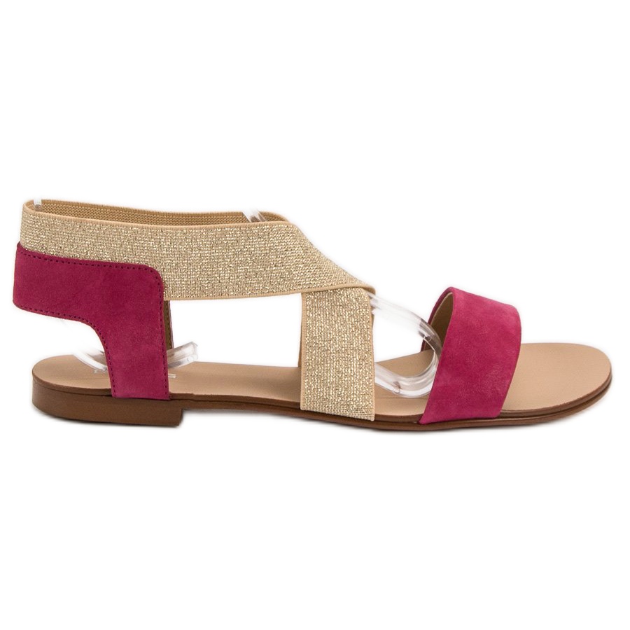 SHELOVET Las elegantes sandalias planas en tonos marrones y rosas son una propuesta ideal para las mujeres que valoran la elegancia y la comodidad. Estos originales zapatos planos combinan un diseño moderno con un uso práctico. Una tira ancha y elástica que se cruza en la mitad del pie proporciona una excelente sujeción, garantizando comodidad en cada paso. Además, dos correas confeccionadas en piel imitación ante en color fucsia intenso les aportan un carácter único.