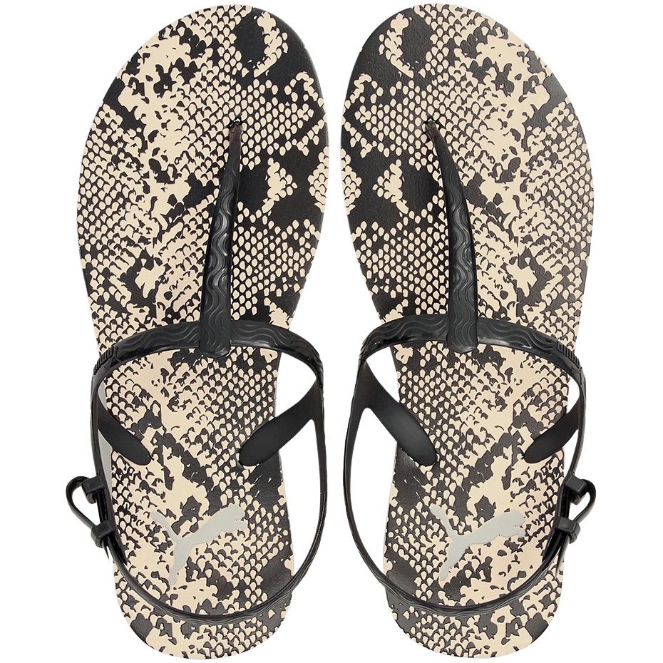 Las sandalias Puma de mujer son perfectas para las salidas de verano. El diseño se asemeja a unas chanclas. Cierre lateral. Suela suave hecha de espuma ligera CMEVA. Textura antideslizante en la parte inferior. Modelo negro con un interesante estampado en el inserto interior.