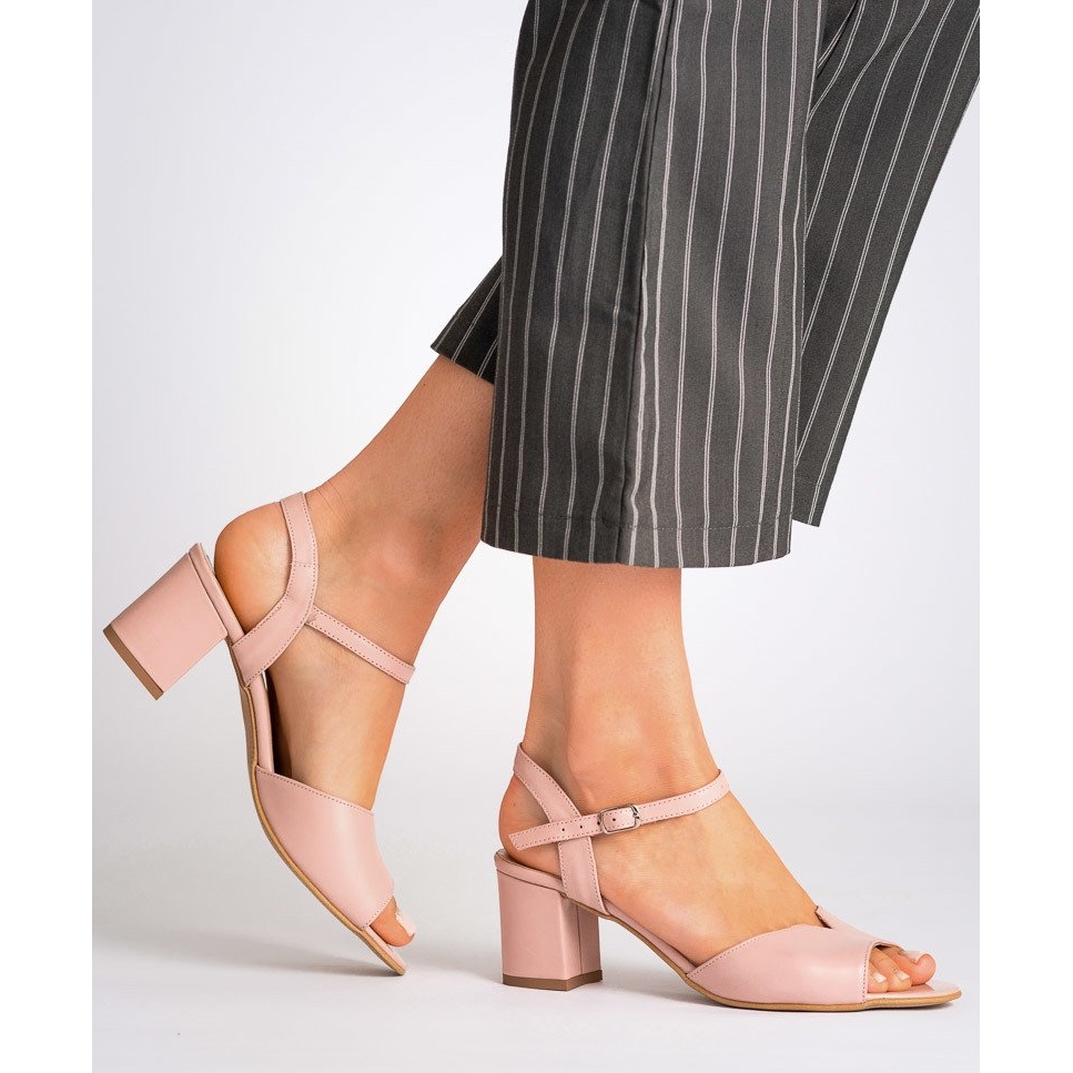 La suela fabricada con material de alta calidad garantiza un agarre y una durabilidad adecuados, algo fundamental para las mujeres activas. El tacón revestido de piel, de 5,5 cm de altura, realza las formas femeninas al tiempo que ofrece comodidad de uso. El sutil color rosa confiere a las sandalias un encanto juvenil y la suela beige crea un elegante contraste que añade sabor al calzado.