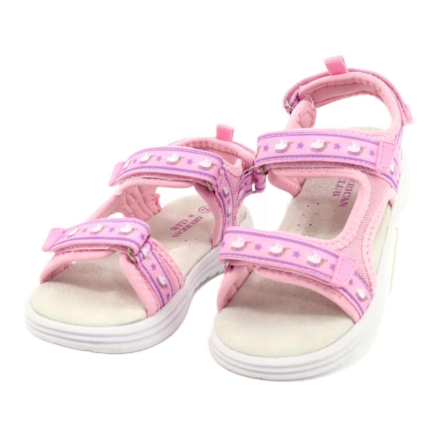 Pink Sandals American Club RL39: calzado encantador y cómodo para un poco de elegantka. Una combinación sutil de elementos rosados y morados y decorativos con un motivo de unicornio en las rayas hará que cada salida sea única. Es la elección perfecta para una chica a la que le gusta presentarse de moda.