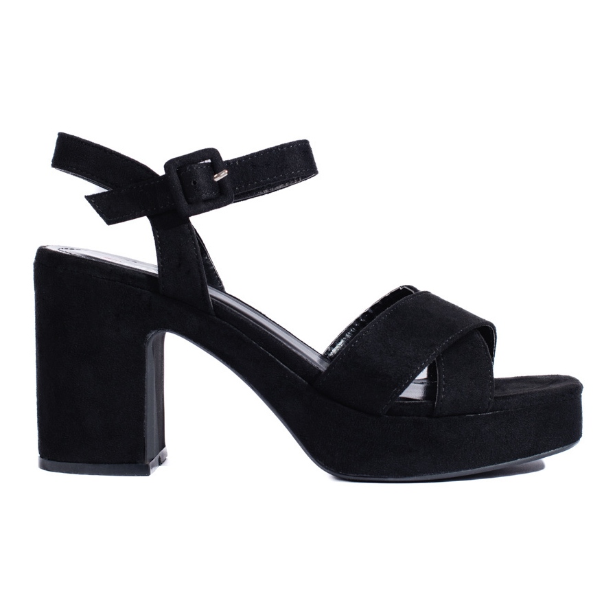La ergonomía y la comodidad están garantizadas gracias al corte cuidadosamente diseñado. Las sandalias con tacón de 9 cm realzan perfectamente la línea de las piernas, y la plataforma adicional de 3 cm garantiza estabilidad y comodidad incluso cuando se usan durante mucho tiempo. La suela de plástico lisa y el tacón abierto son otros elementos que demuestran el cuidado diseño del modelo. La puntera abierta y el cierre de hebilla no solo añaden carácter a las sandalias, sino que también permiten un fácil ajuste al pie.