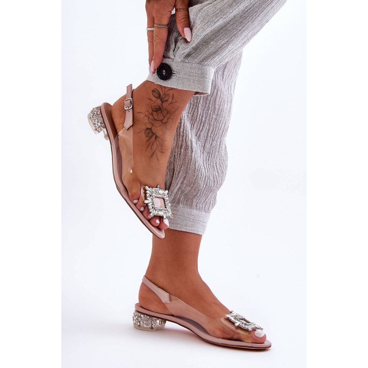 Sandalias elegantes y femeninas que agregarán ligereza a cualquier estilización. Una parte superior transparente combinada con una decoración de joyas en los elementos delanteros y plateados crea un efecto sutil y de moda. Ubicado en un tacón plano de 3 cm decorado con tachuelas, perfecta en primavera y verano, cuando busca una combinación de comodidad con elegancia.