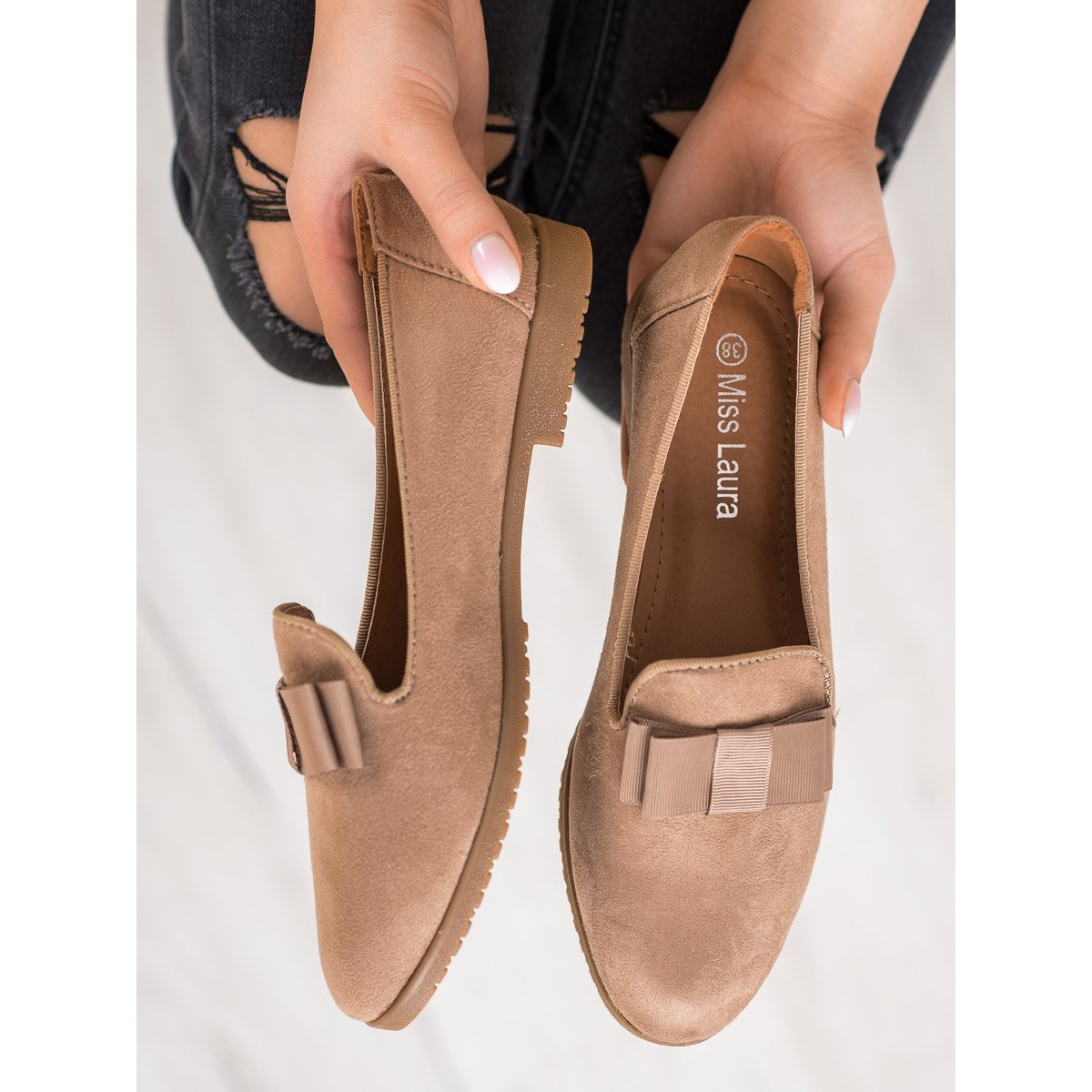 Los señores Miss Laura con lazo marrón son una opción ideal para las mujeres que buscan una combinación de practicidad y elegancia. Su color marrón claro combina sutilmente con cualquier cutis, aportando luminosidad y encanto. Hechos de gamuza ecológica de alta calidad, estos zapatos brindan no solo una apariencia estética, sino también comodidad de uso.