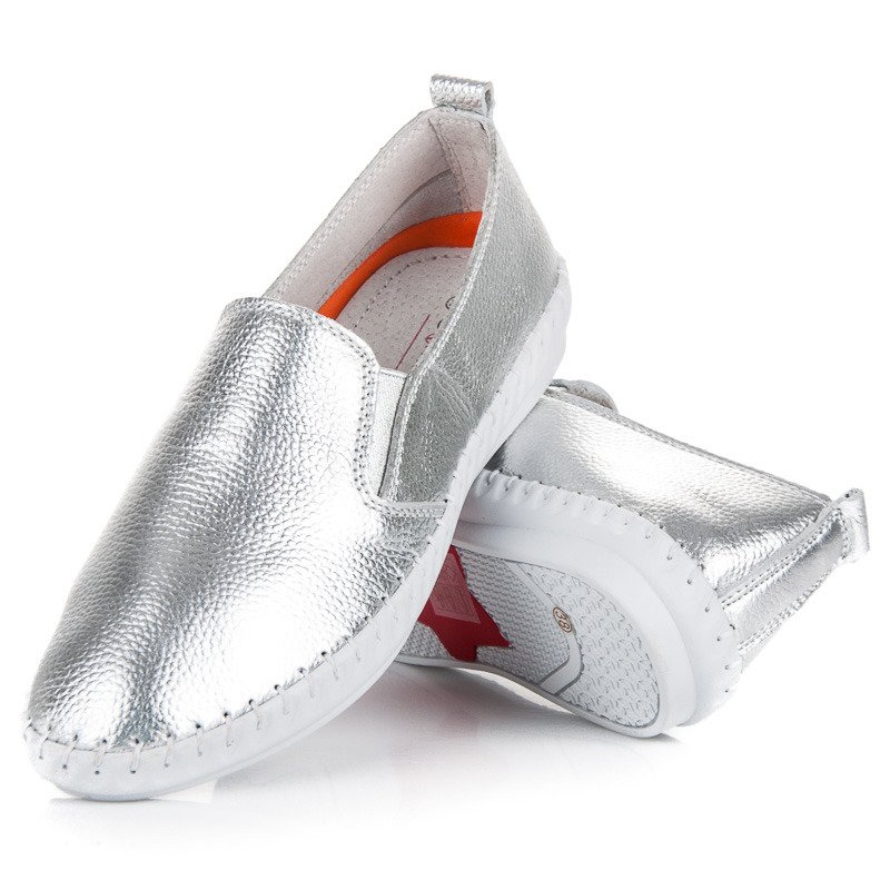 Las zapatillas plateadas VINCEZA en gris son una opción perfecta para las mujeres que desean agregar un poco de extravagancia a su estilo. Estos zapatos de moda tienen una apariencia inusual que seguramente llamará la atención. Fabricados en cuero natural de alta calidad, garantizan no sólo durabilidad, sino también una comodidad excepcional. Su altura baja y su puntera redonda los hacen perfectos para el día a día.