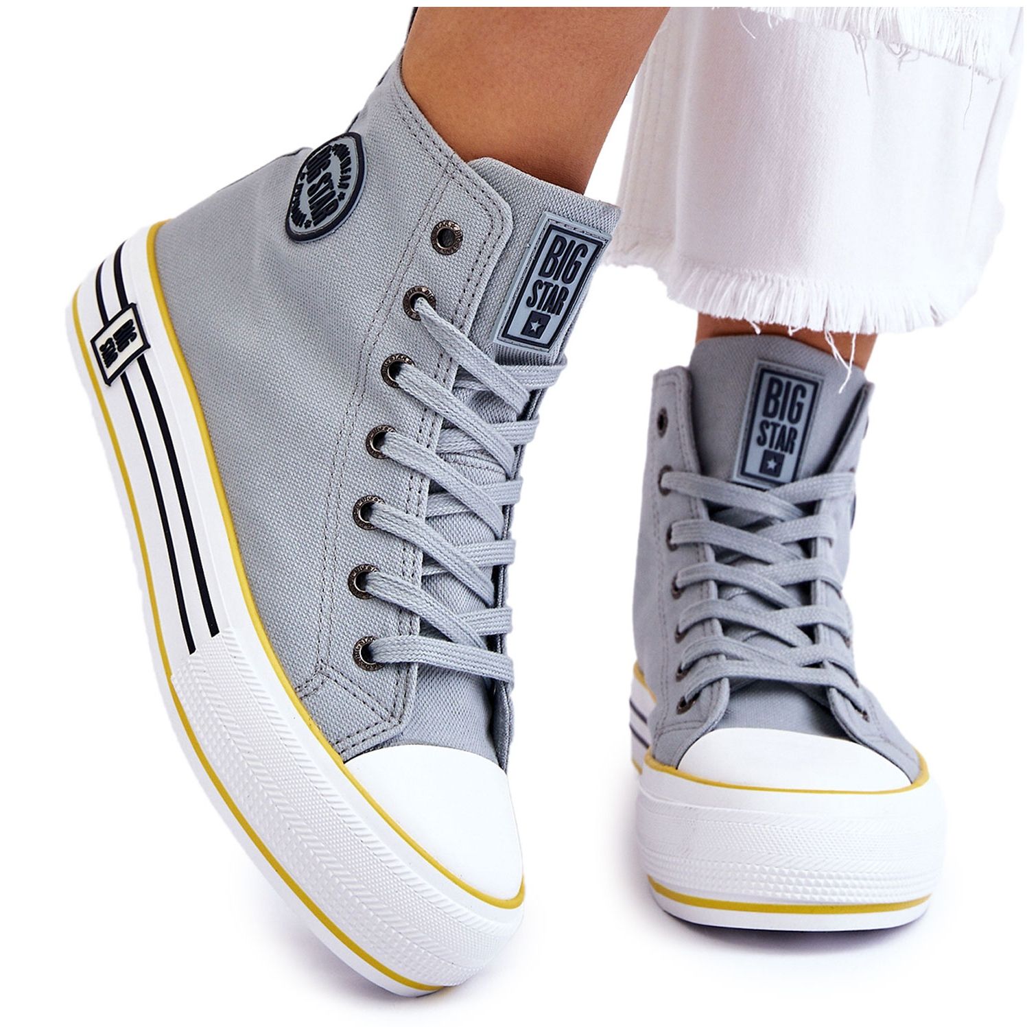 Las zapatillas de deporte altas hechas de material textil duradero, montados en una plataforma de goma masiva (3.5 cm de altura) con una suela sinlips. El cordón clásico permite un buen ajuste, y el talón rígido asegura la estabilización del pie. Un logotipo sutil de goma de la marca Big Star en el costado de la parte superior. El modelo de tobillo es ideal para la luz de la temporada de primavera en el otoño, aireado y al mismo tiempo sosteniendo la pierna.