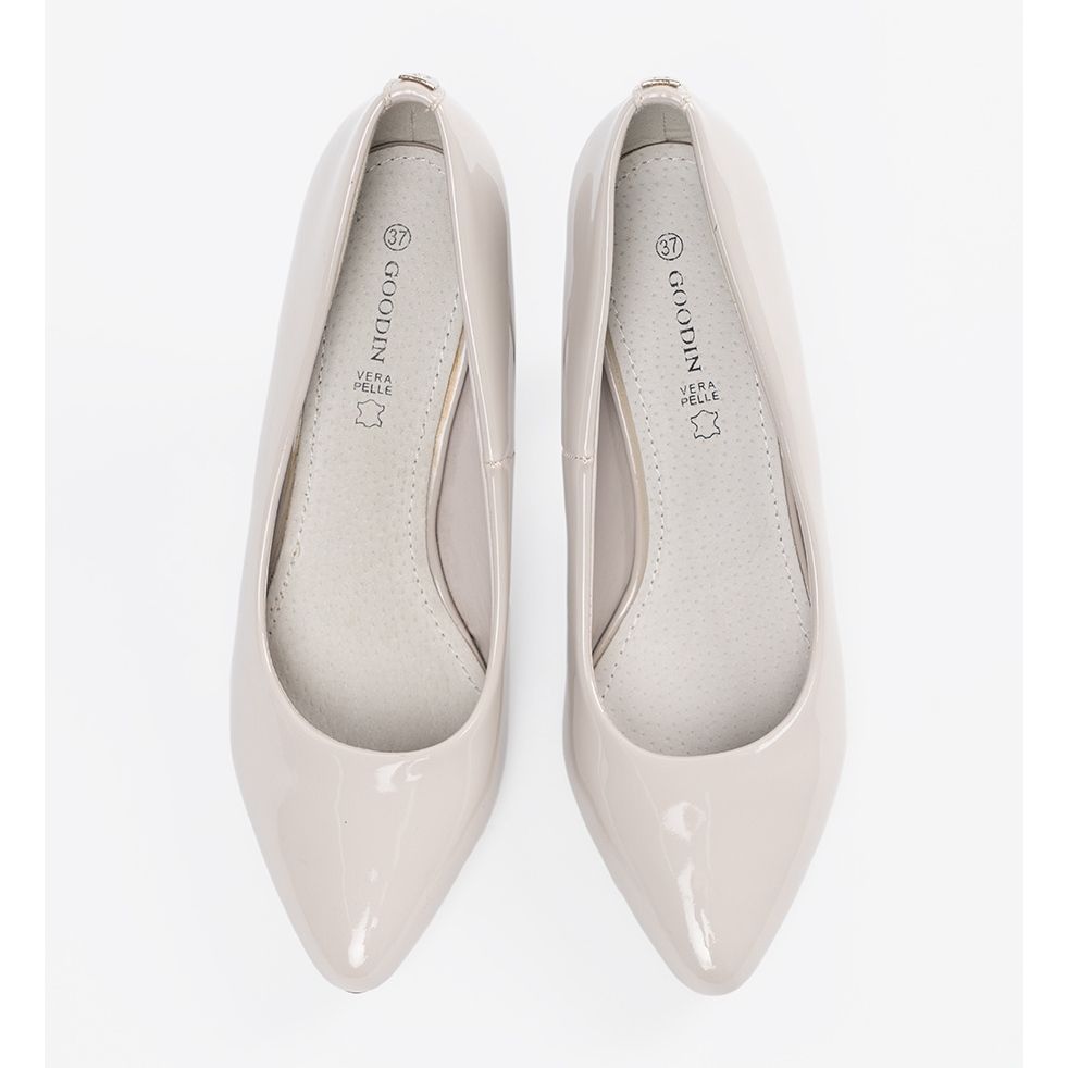 Presentamos los elegantes tacones de mujeres de las mujeres barnizadas de color gris claro de la famosa marca Goodin, que son la combinación perfecta de estilo y comodidad. Hecho de cuero ecológico barnizado de alta calidad, estas bombas definitivamente atraerán la atención con su brillo único y un tono de moda.