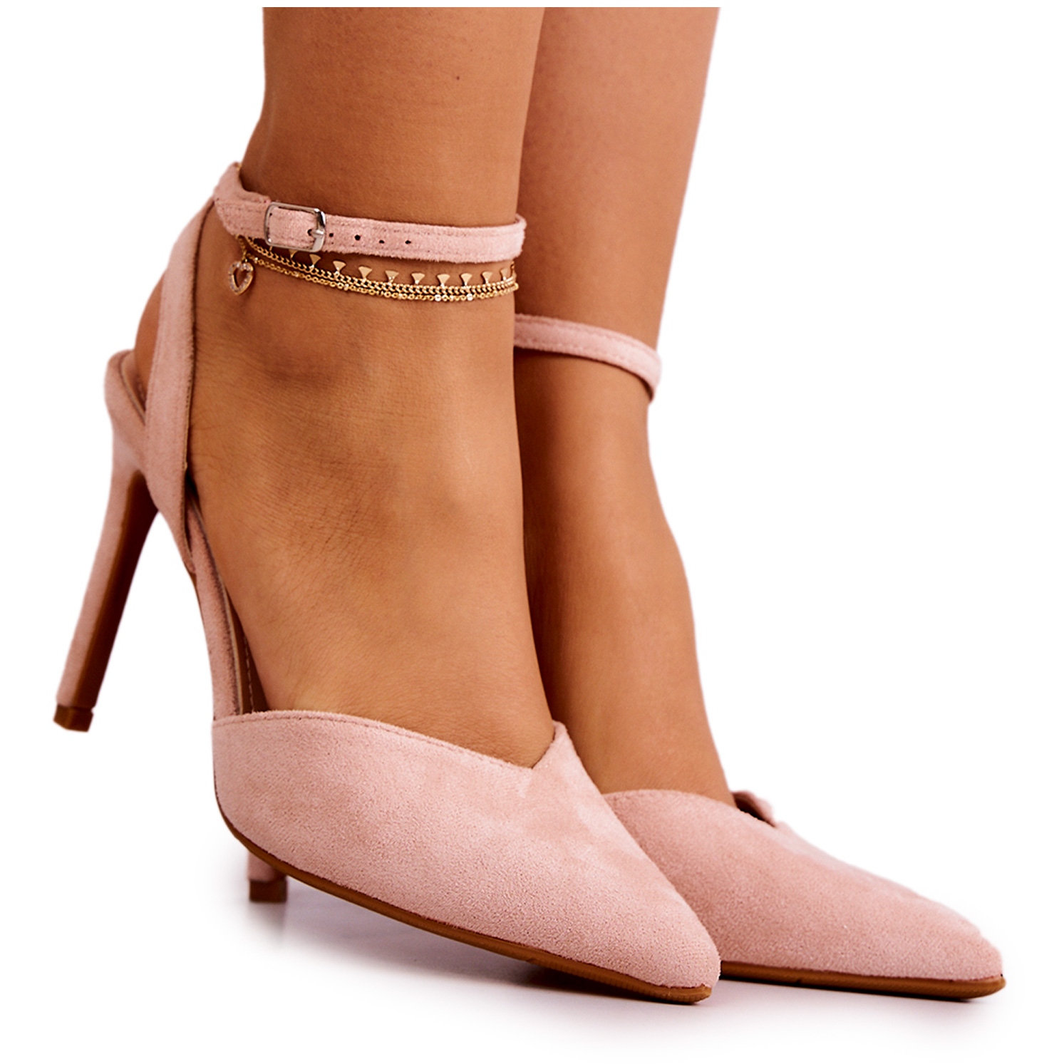Estos son elegantes y estilosos tacones altos FB2 en rosa claro, ¡perfectos para el estilo de verano! Confeccionados en piel ecológica de ante, combinan comodidad y diseño moderno. El modelo se caracteriza por una parte delantera cubierta con puntera en punta y tacones abiertos, lo que aporta ligereza y feminidad.
