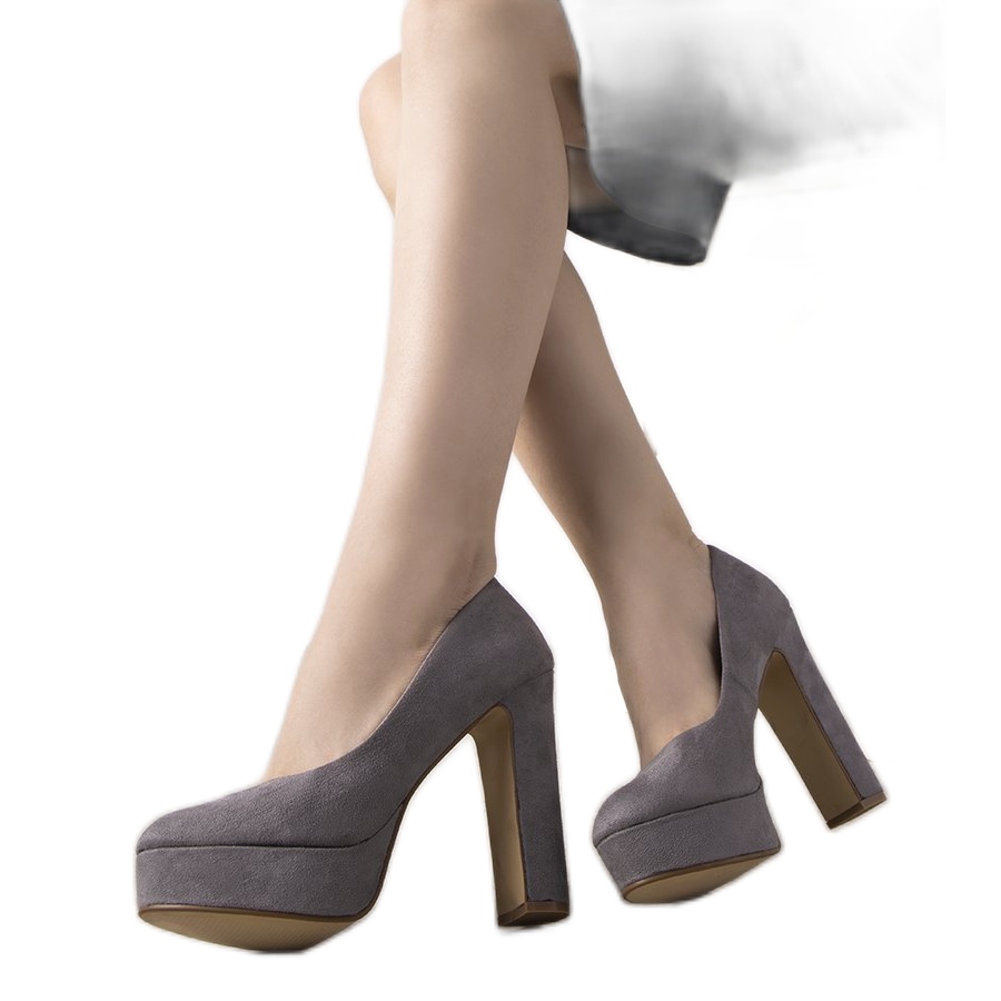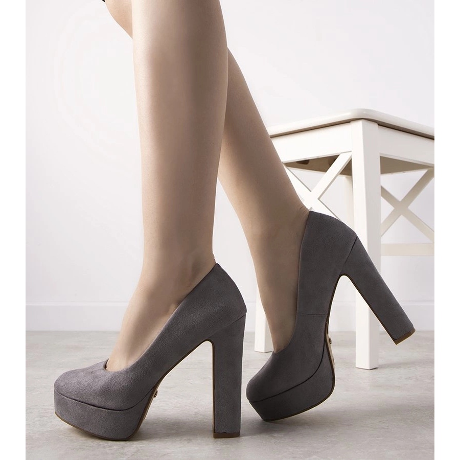 Los zapatos de tacón combinan perfectamente con una variedad de atuendos, gracias al color gris, que a veces el fabricante llama "gris". Se caracterizan por la falta de sujetadores adicionales: son deslizantes. La ventaja de estas bombas es una cómoda plataforma que compensa la altura de 12,5 cm.